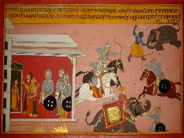 | Description / विवरण | Miniature painting based on Prithviraj Raso depicting Chand Pundeer requesting Sanjogita not to be worried and says that his all commanders are experts and skilled who can even break the trunk of elephants in the way Krishna cut the trunk of an elephant. |