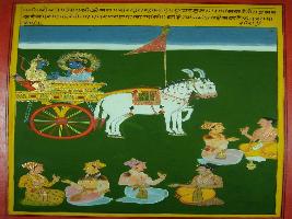 | Description / विवरण | Miniature painting based on Shri Bhagwat Gita. It depicts Krishna preaching Arjun that if you respect the other person by doing Pranam and take care of him then people will praise you and you will be considered as learned person. |