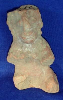 | Description / विवरण | Terracotta human figurine in seated posture. Both the hands and legs are missing. The eyes are appliqued with incised holes, nose and lips are prominent. |