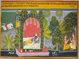 | Description / विवरण | Miniature painting based on Geet Govind depicting Radha telling her friend about her loving union and meeting with Krishna. |