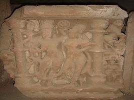| Description / विवरण | A sculptured architectural fragment of a pillar depicting probably Vishnu and Lakshmi, attributes from right below, 1 resting 2 holding a mace 3 holding a chakra 4 hand resting on Lakhsmi s shoulder. Both are in standing position, they are flanked by attendants, on both side and upper left, having a mythical lion. |