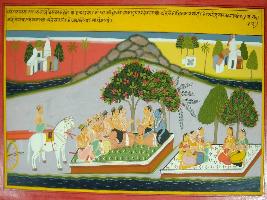 | Description / विवरण | Miniature painting based on Mahabharat - Virat parva depicting Yudhisthir says to sage Dhaumya that You take Agnihotra, moves to Drupad s state. There he would get Indra sena-charriot driver who will take him to Dwarika. Then he ask draupali to move to panchal with maids. |