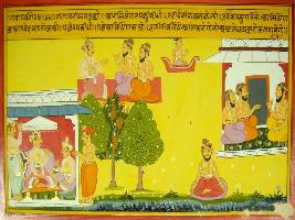 | Description / विवरण | Miniature painting based on Mahabharat - Gada parva depicting Raja Parikshit is asking Vespayana about importange of Pilgrimage. Veshpayana is telling him pilgrimage and penance. |