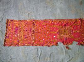 | Description / विवरण | This is Rumaal Lal Jamin with glass and silk thread work on cotton cloth. It has geometrical designs triangular phunda work on two sides in red, green, yellow colours. Glass work is in circular and triangular shape. DAM NO. 64 21. |