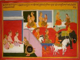 | Description / विवरण | Miniature painting based on Mahabharat - Adi parva depicting Pandu taking leave from Dhritrashtra. Bhishma shown leaving in Chariot at lower part. At upper part is shown marriage and love making of Madri and Pandu. |