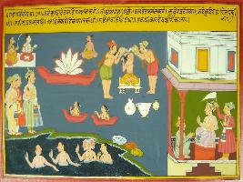 | Description / विवरण | Miniature painting based on Mahabharat - Gada parva depicting Brahma with other gods took holy bath in Sarjaypa tirtha and made it holiest. Baldev also took bath in it. There is story related to this tirtha which is depicted in painting. Here Kuber does penance Brahma gave him boon and made him on one of digpala. |