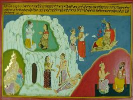 | Description / विवरण | Miniature painting based on Mahabharat - Adi parva depicting Vyas telling king that Indra touched the hand of a woman and he was cursed for that. To get rid of the curse he had done a hard meditation in a cave, Shiv and a king is depicted asking Vishnu how to get rid of the curse. |