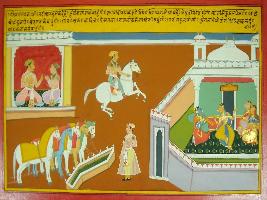 | Description / विवरण | Miniature painting based on Mahabharat - Virat parva depicting Agyatvas of Pandavas. Arjun says that he will took attire of Chimera and teach Uttara for dance and music and his name will be Vrihandala Nakul says that, he will be working for taking care of horses of king. |
