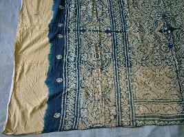 | Description / विवरण | This is a chunri with bandhej work in white and bluish green base. Thick beige colour on both sides of border. Chunri designs are present on the surface. Lining is in white colour without designs. It is consisting of floral designs |