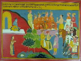 | Description / विवरण | Miniature painting based on Mahabharat - Adi parva depicting Vyas telling Dhrupad about Draupadi who was the daughter of a sage in her last birth and who prayed Mahadev to get five husbands. And by understanding this Dhrupad allows Pandavas to marry her. |