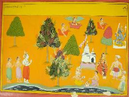 | Description / विवरण | Miniature painting based on Mahabharat - Gada parva depicting Balarma is going for Pilgrimage where Brahmans is doing yagna the upper left Vishnu is seen and Gandharwas and apsaras are seen moving on thier Vimans in the sky. |