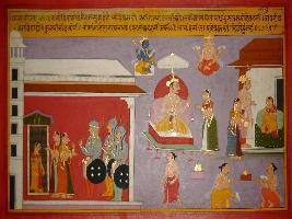 | Description / विवरण | Miniature painting based on Prithviraj Raso depicting Sanjogita saying to Chaneman that by getting married with Prithviraj she fall down the glory of her family and lost her father, mother and brother. |