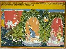 | Description / विवरण | Miniature painting based on Geet Govind depicting Radha telling her friend about their loving union. She is telling her that how she enjoyed the love making which fills her with immense pleasure. |