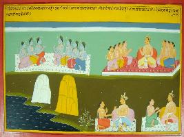 | Description / विवरण | Miniature painting based on Mahabharat - Virat parva depicting Indra with all weapons and eleven Rudras bestowing Arjun. |