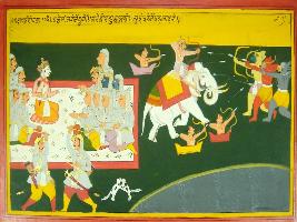 | Description / विवरण | Miniature painting based on Mahabharat - Gada parva depicting vigorous fight between Bhim and Duryodhan, Some as that of between Indra and Prahlad. |