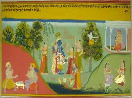 | Description / विवरण | Miniature painting based on Geet Govind, where Jaidev says about the Holi festival that performed by Krishna, Radha and other gopis, while Kamdev is seen in the upper side. |