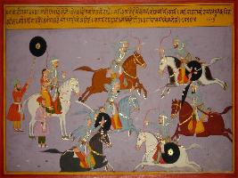 | Description / विवरण | Miniature painting based on Prithviraj Raso depicting Panga sending Ravan Kotwal to arrest Prithviraj along with Sanjogita. Commanders of Prithviraj are depicted fighting with the army of Panga king. |