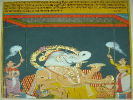 | Description / विवरण | Miniature painting based on Rasikpriya depicting four armed Ganesh sitting on the throne and four females serving him. |