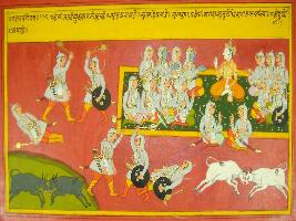 | Description / विवरण | Miniature painting based on Mahabharat - Gada parva depicting Bhim and Duryodhan is fighting vigorously some as bulls and buffalos fight. Later Bhim attacks on the thigh of Duryodhan and Duryodhan fall down on the ground. |