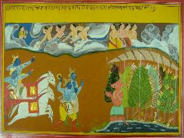| Description / विवरण | Miniature painting based on Mahabharat - Adi parva depicting war between Krishna, Arjun and Indra. Indra in depicted on the sky and on the lower part Krishna and Arjun depicted fighting with a demon. |
