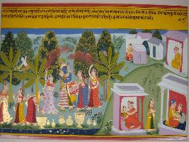| Description / विवरण | Miniature painting based on Geet Govind depicting scene from Vrindavan of Krishna doing Raas Lila, on the other side is depiction of a village. |