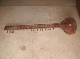 | Description / विवरण | Veena with two round pumpkin shaped base supports, partly damaged, having arched leaf raised decorations over it, fixed to the two sides of the round cylindrical handle. The middle portion of the handle has fifteen raised wooden frets over it. The rest are missing. It has three wooden knobs at the upper portion of the handle and a stretcher at the lower portion for stretching the strings along with a small peacock figure to tie the strings. Its strings are missing. |
