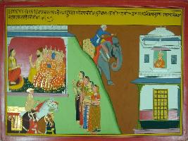 | Description / विवरण | Miniature painting based on Mahabharat - Adi parva depicting Dhrupad sending elephants, 100 female servant, 100 clothes, and many precious jewellery as dowry to Pandavas on marriage of his daughter Draupadi. Draupadi is sitting in front of sage and Pandavas at the upper right part. |