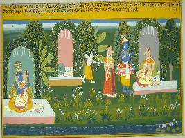 | Description / विवरण | Miniature painting based on Geet Govind depicting Krishna and Radha sitting and he embracing her, while on its left Radha Krishna are seen seated. |