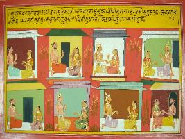 | Description / विवरण | Miniature painting based on Mahabharat - Udyam parva depicting various couples sitting and talking together, they are kings and sages depicting Urvasi with Puru, Satyawati with Rachik, Shakuntala with Dushyanta, Dhriti with Dharama etc. |