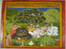 | Description / विवरण | Miniature painting based on Rasikpriya depicting Krishna and Radha sitting in the garden and gopis serving them. |