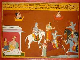 | Description / विवरण | Miniature painting based on Prithviraj Raso depicting Prithviraj in dilemma of whether to fight or be with Sanjogita. At last he decided to be with Sanjogita instead of fighting. |