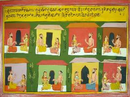| Description / विवरण | Miniature painting based on Mahabharat - Udyam parva depicting sages are sitting with their wives and having fun. |