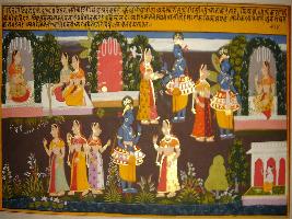 | Description / विवरण | Miniature painting based on Geet Govind depicting at the upper left side Krishna telling Radha not to worry though he meets other gopis. Radha expressing her grief to Krishna. At the upper right Radha is talking with her two friends in the garden. |