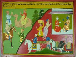 | Description / विवरण | Miniature painting based on Mahabharat - Adi parva depicting Krishna and Baldev sitting and getting ready to visit Pandavas at upper left part. Rath, horses, elephants, camels etc. are being prepared. |