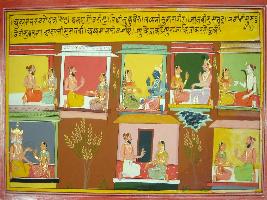 | Description / विवरण | Miniature painting based on Mahabharat - Udyam parva. The painting depicts Agyastra, Kubera, Vishnu, Shiv, Brahma are sitting with their wives and talking to them. |