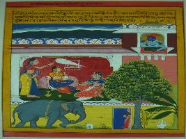 | Description / विवरण | Miniature painting based on Rasikpriya depicting Radha and her friends in the palatial balcony talking about Krishna. While Krishna is depicted in the upper part of the painting. In the lower part of the painting an elephant tied by an iron chain is seen. |