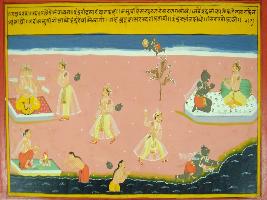 | Description / विवरण | Miniature painting based on Mahabharat - Gada parva depicting Vaispayan is telling Janmejeya about story Indra gettling brahma hatya. Nemuchi demon went in shelter of sun. Indra killed demon with his head chopped off. Demon s head followed Indra. Indra went to Brahma and he told him Indra to take bath in Saraswati river. He took bath and get rid of head. |