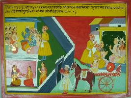 | Description / विवरण | Miniature painting based on Mahabharat - Adi parva depicting Duryodhan taking to Pandavas and Krishna at the upper right part. Below this, queens are shown sitting and talking. At the left part Vidur is shown talking with Dhritrashtra and Bhishma. |
