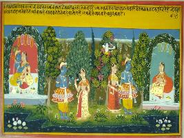 | Description / विवरण | Miniature painting based on Geet Govind depicting of holy union of Krishna and Radha. Kamdev is depicted sitting on tree with bow and arrow. |