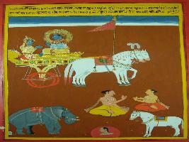 | Description / विवरण | Miniature painting based on Shri Bhagwat Gita. On the painting depicts Krishna and Arjun that the man who suspect on god or who has some stupid mind is gets place at hell. |