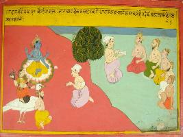 | Description / विवरण | Miniature painting based on Mahabharat - Gada parva. The painting depicts that Vaspayan is folded his hand in Namaskara mudra and paying respect to Narayan Saraswati and Narad. While in the other part of the painting depict that Vaspayana is talking with king Janmejaya and four other Brahmans. |