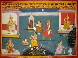 | Description / विवरण | Miniature painting based on Prithviraj Raso depicting kotwal Ravan and Jaichand talking to each other when poet Chandvardai arrives, seeing whom Ravan become happy. |