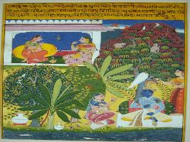 | Description / विवरण | Miniature painting based on Rasikpriya depicting Radha and Krishna seated and feeling love for each other. Radha s friend is delivering her condition to Krishna. |