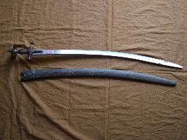 | Description / विवरण | It is a sword with a curve cutting edge one side and the other side is flat with sharp cutting edge. It is fixed with a decorated Shahjahani hilt. The decoration is done on the border of the hilt in golden koft with floral and geometrical motif. Scabbard is plain. |