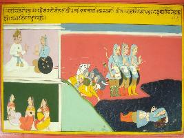 | Description / विवरण | Miniature painting based on Mahabharat - Gada parva. The painting depicts that Kitavarma, Kripasarya, and Aswasthama came to meet. Druyudhan in the lake while Dhritrashtra is seen with Sanjay where Sanjay informing him about Druodhana. In the lower part Gandhari also seen followed by two female attendants. |