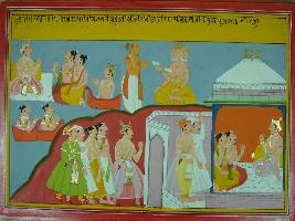 | Description / विवरण | Miniature painting based on Mahabharat - Adi parva depicting Swateki performing yagna and Agni and other gods coming to Brahma to describe it. |