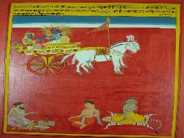 | Description / विवरण | Miniature painting based on Shri Bhagwat Gita. It depicts Krishna preaching Arjun that there people perform yagna who left their karma. He again says that through knowledge doubt clears and people become intellectual and find their karma. |