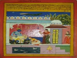 | Description / विवरण | Miniature painting based on Rasikpriya depicting Radha touching the feet of Krishna who is sitting on an asana. Two other females are seen with them. A peacock is seen on the roof of the palace. |