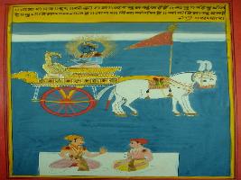 | Description / विवरण | Miniature painting based on Shri Bhagwat Gita. It depicts Krishna preaching Arjun that without hard work intelligence is not there, without Brain feeling is not there and without feeling peace and happiness do not exist. |