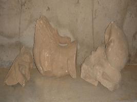 | Description / विवरण | An architectural fragment of a seated lion, probably a part of an entrance. The head is broken and lower end is also missing. Its mouth is open and has long curly hair lying on the shoulder. |